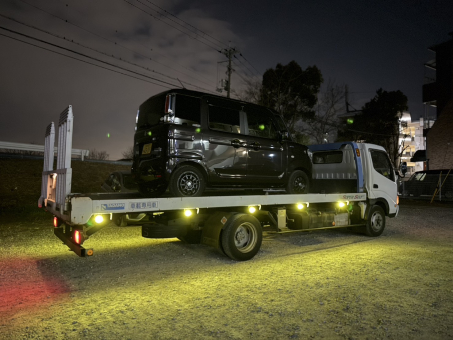 「スペーシアの事故修理もお任せ!電柱衝突でテール不点灯の車両を緊急レッカー。