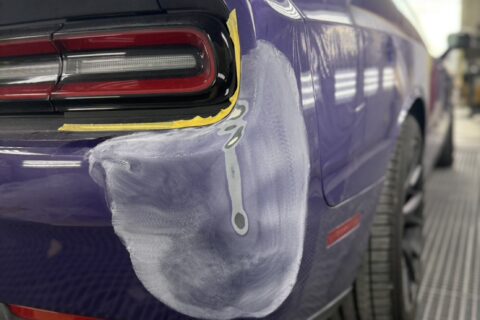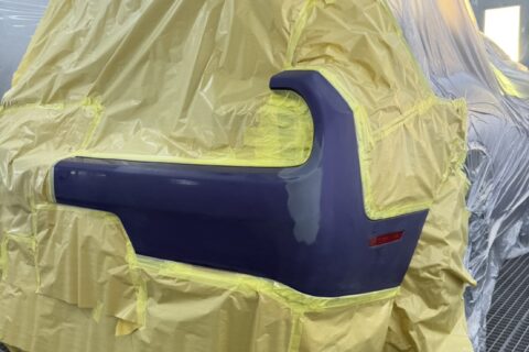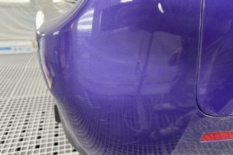 今回の修理はリアバンパーの板金塗装です。交換を選ぶとアメリカ本国発注で長期化してしまうため、当店では板金修理を選択。精度の高い整形と塗装で、オリジナルのフォルムと光沢を忠実に再現しました。特にパープル系のカラーは角度によって印象が変わるため、細部まで慎重に仕上げています。
