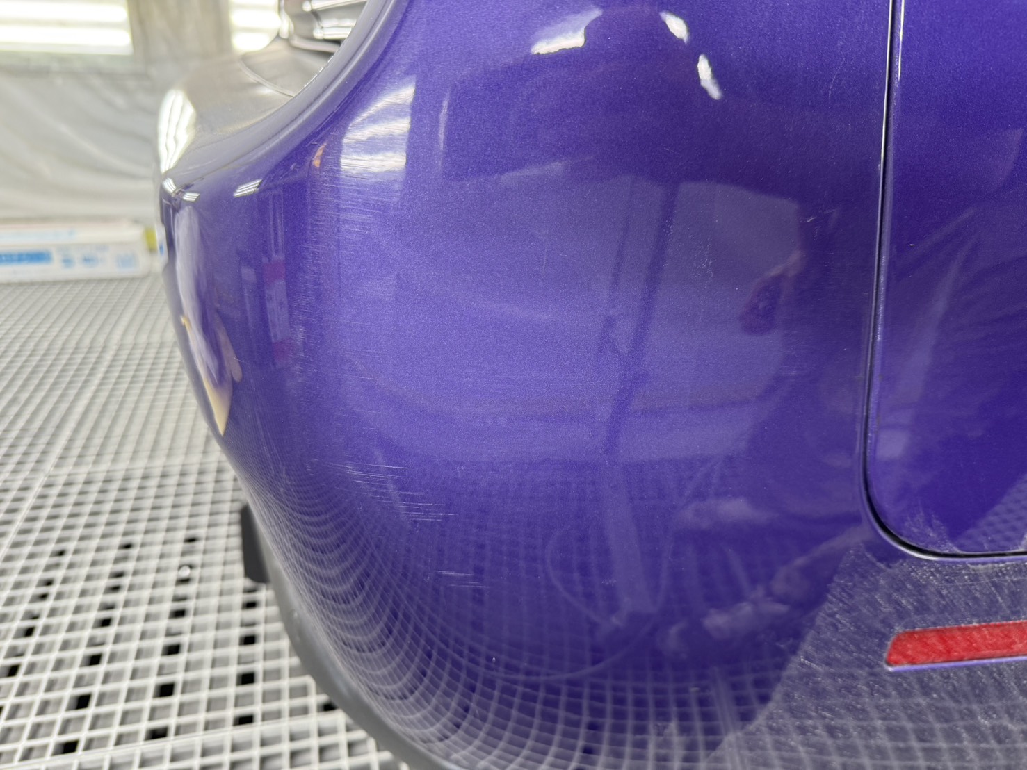 まずはバンパーの凹みやキズを入念に確認。特殊カラーのパープルは光の当たり方で色味が変わるため、塗装前に慎重に色合わせを行います。