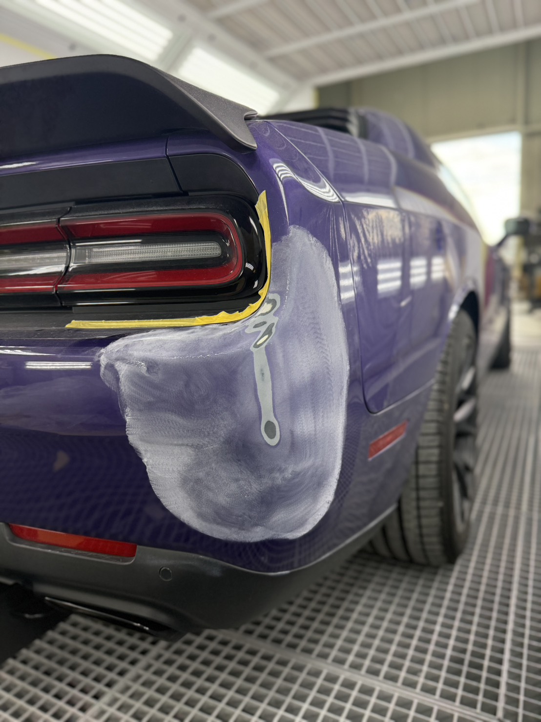 オーナー様の愛車の迫力あるリアビューを損なわないよう、パープルの特殊カラーを丁寧に調色し、オリジナルの艶と深みを忠実に再現。