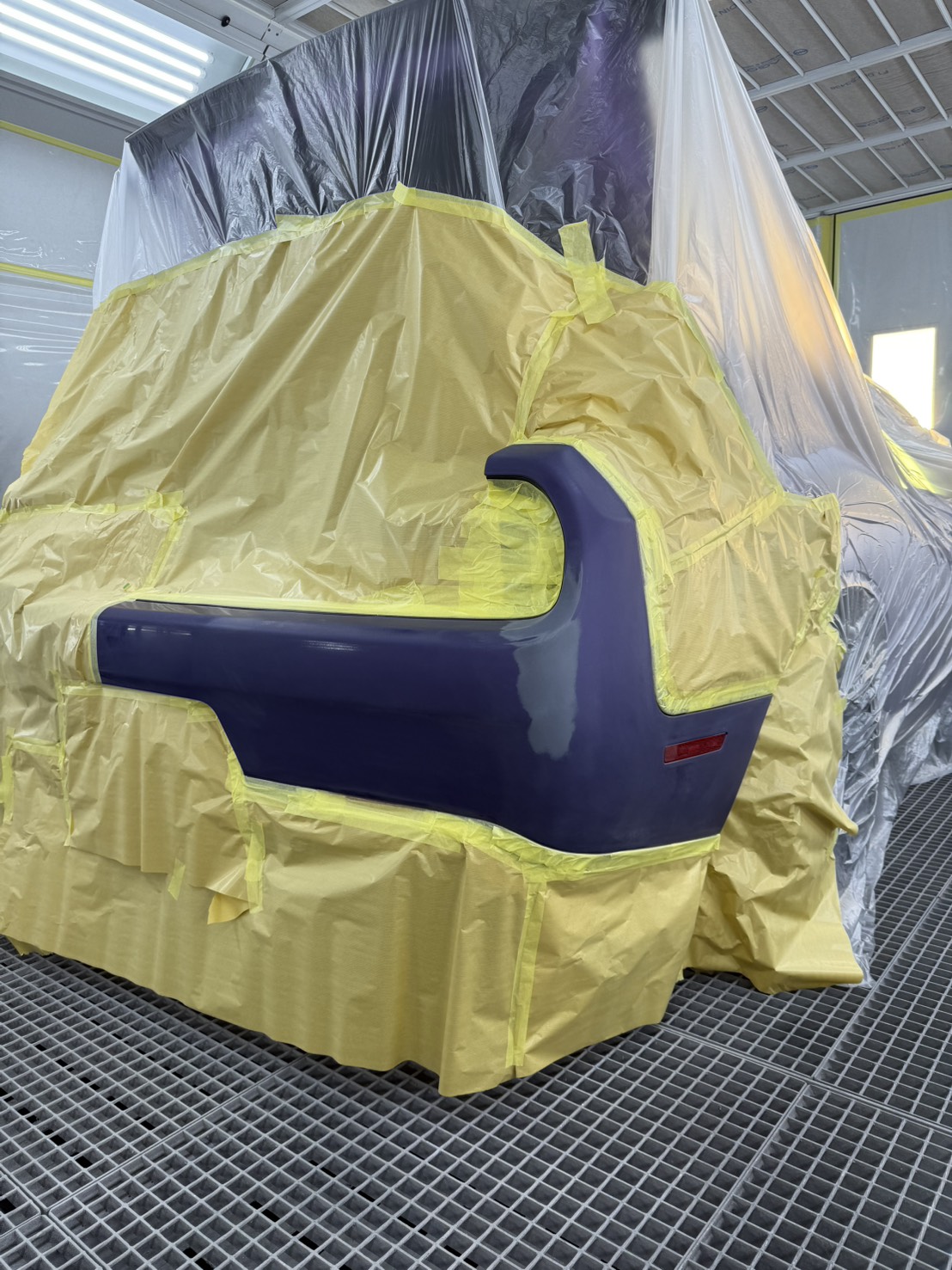 パープルの特殊カラーは微妙な色差で印象が大きく変わります。専用調色で車体にぴったり合う色を作り、塗装ブースでムラなく塗装できる準備を整えます。