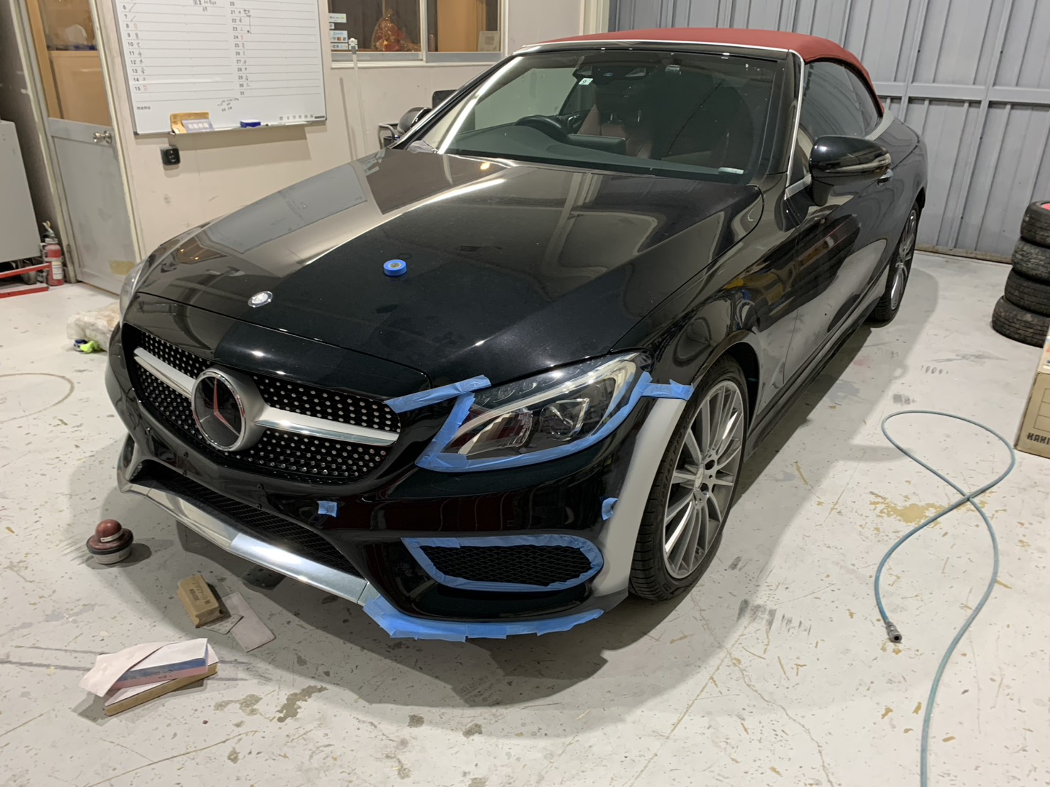 【ベンツ Cクラス カブリオレ 修理】フロントバンパー&サイドスカートを板金塗装|桜井市 GLOW ART
