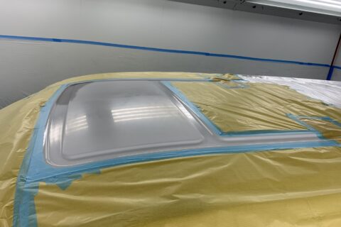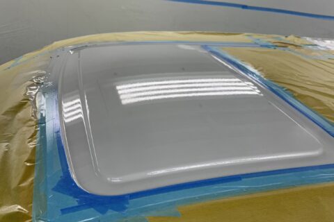 ベンツVクラスのルーフ部分は広い面積を持つため、紫外線や経年劣化の影響を特に受けやすく、塗装のめくれやクリア層の劣化が起こりやすい箇所です。今回の車両も表面の塗装が浮き上がっており、見た目だけでなく今後の腐食の原因にもなりかねない状態でした。まずは劣化した塗装をしっかり除去し、密着性を高めるために丁寧な下地処理を行いました。