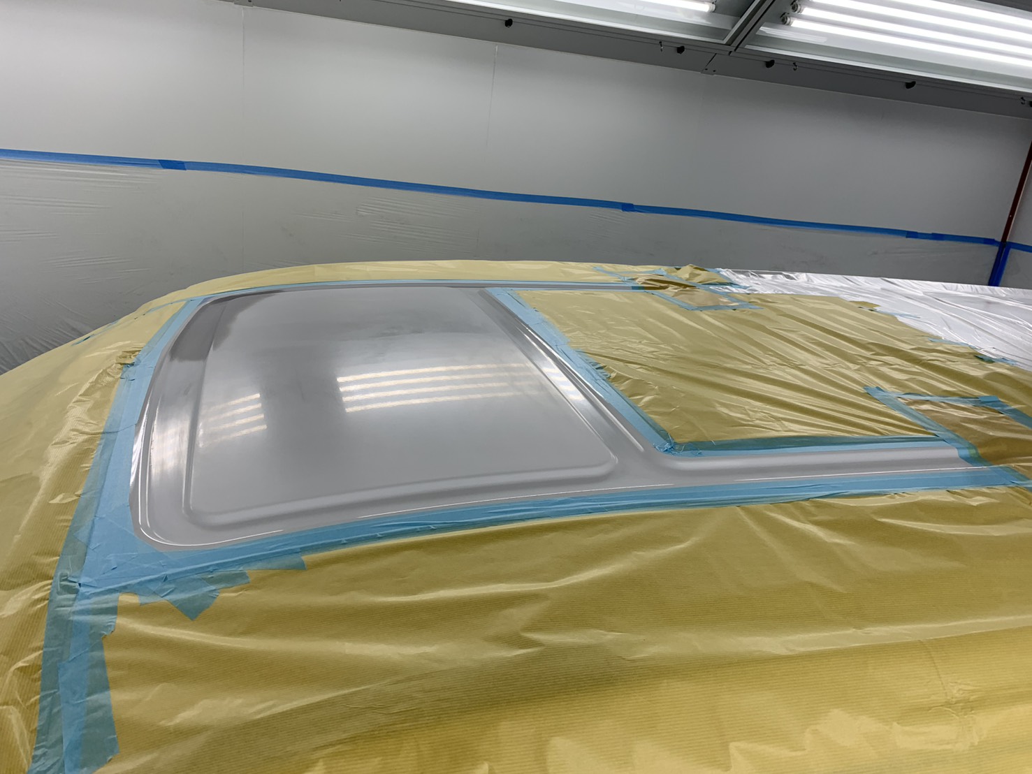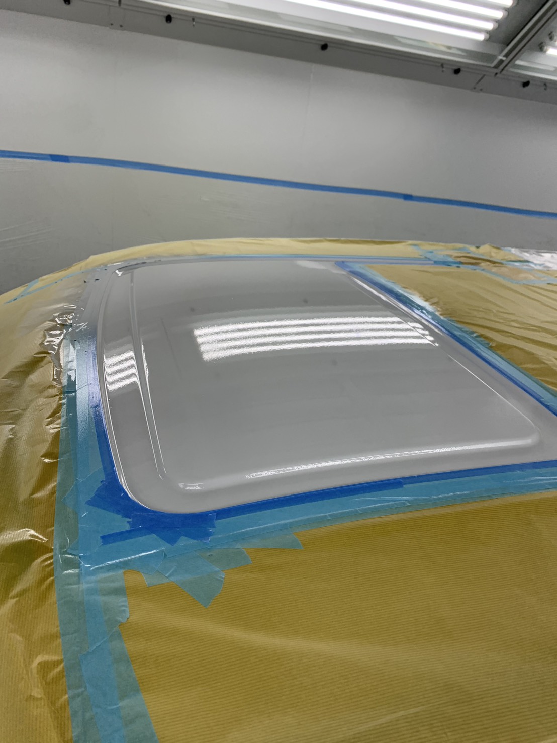 ベンツVクラスのルーフ部分は広い面積を持つため、紫外線や経年劣化の影響を特に受けやすく、塗装のめくれやクリア層の劣化が起こりやすい箇所です。今回の車両も表面の塗装が浮き上がっており、見た目だけでなく今後の腐食の原因にもなりかねない状態でした。まずは劣化した塗装をしっかり除去し、密着性を高めるために丁寧な下地処理を行いました。