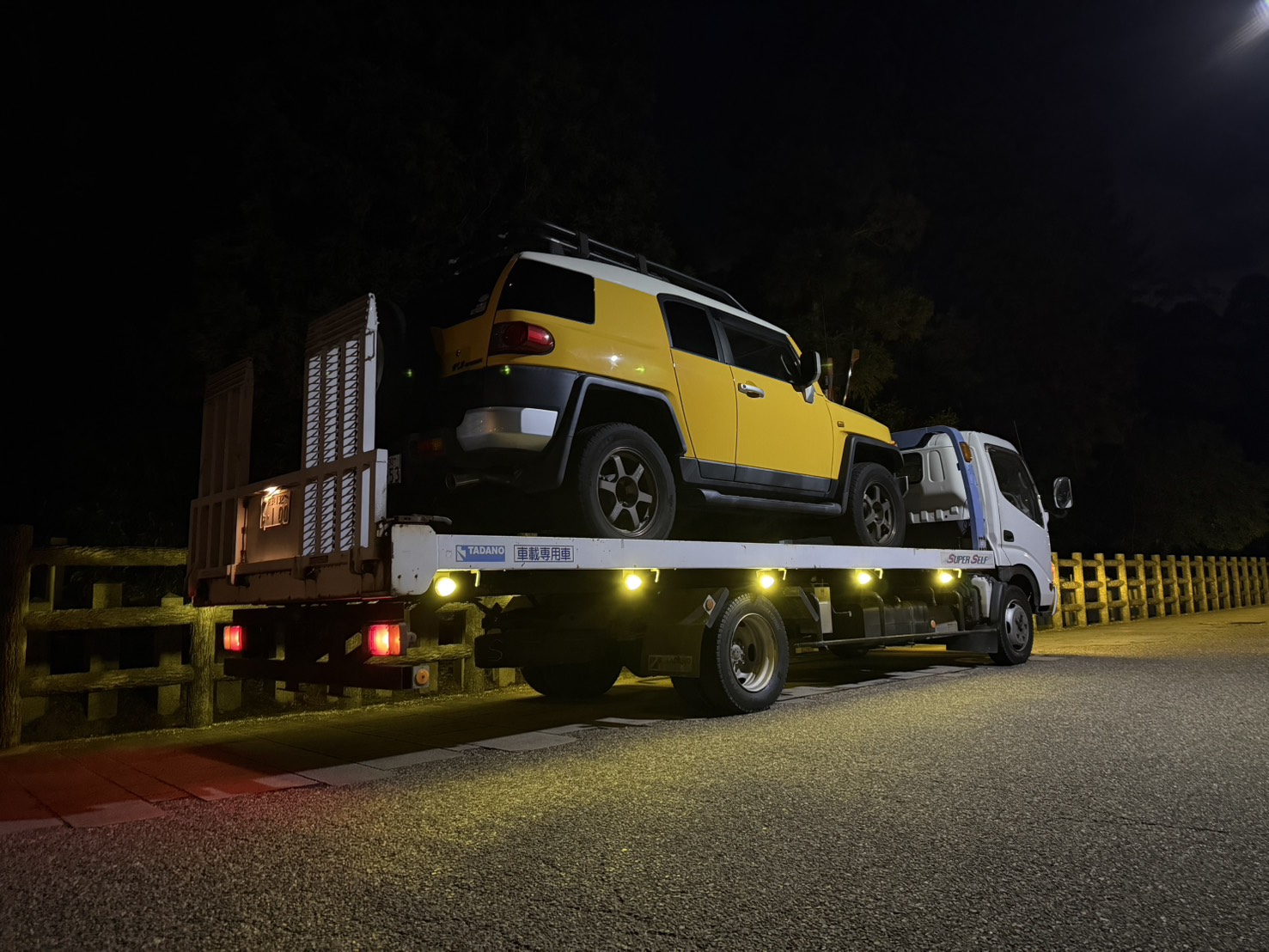 信号待ちでの不意な追突被害……。屈強なボディを持つトヨタのFJクルーザーですが、後方からの強い衝撃により背面タイヤやリアゲート、バンパーが大きく損傷してしまいました。自走が困難なほど深刻なダメージでしたが、オーナー様よりお電話をいただき、すぐに自社積載車で現場へ急行。安全にお車を回収いたしました。