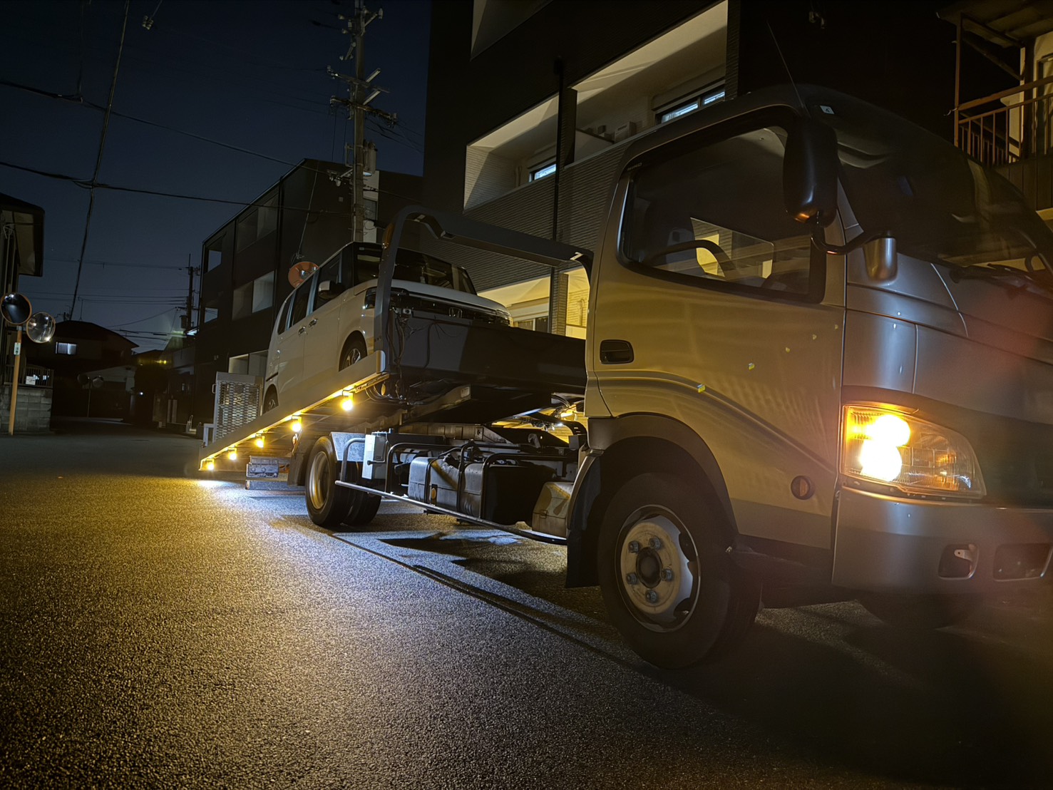 お電話から最短ルートで現場へ。二次被害(ホイールへのさらなる傷など)を防ぐため、慣れた手つきで迅速にレッカー車へ積み込みます。