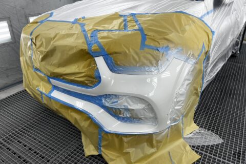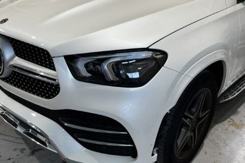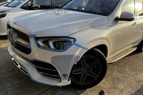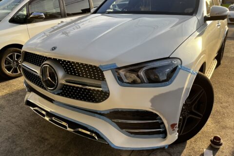 奈良県桜井市にお住まいのお客様より、ベンツ・GLEのフロントバンパーにできたキズとヘコミの修理をご依頼いただきました。輸入車ならではの高級感やデザインを損なわず、元通りの美しい仕上がりを目指して作業を行いました。
