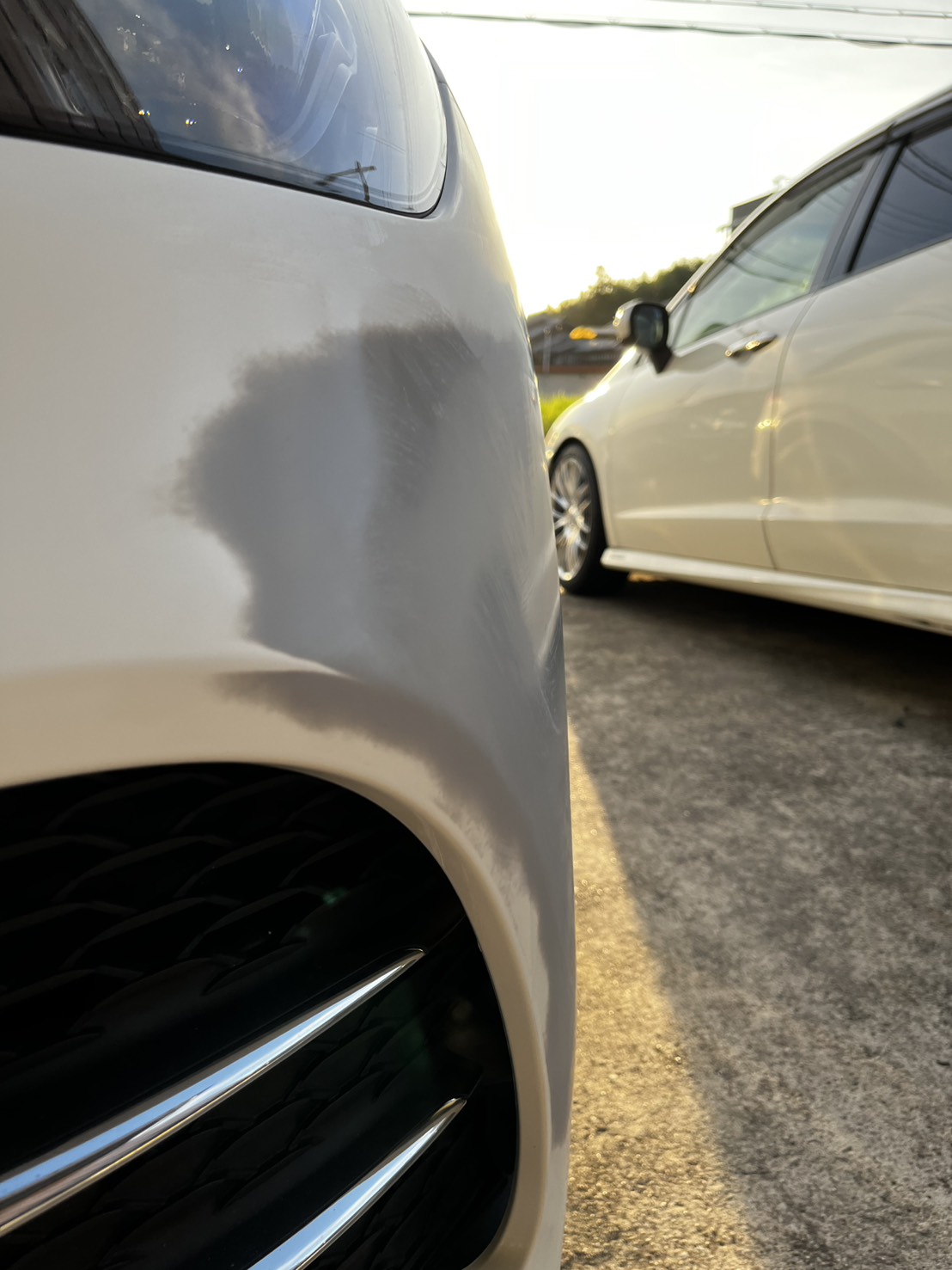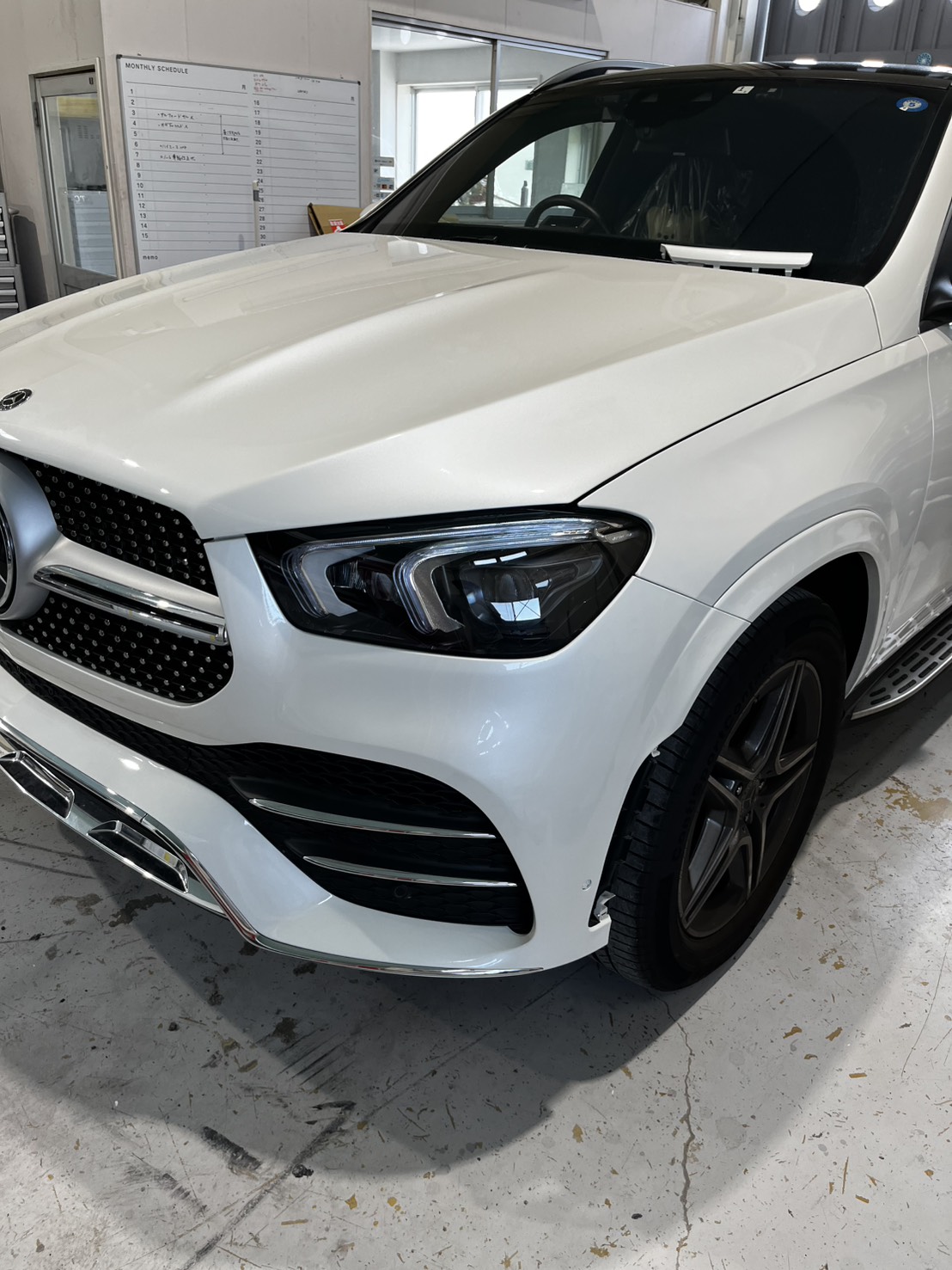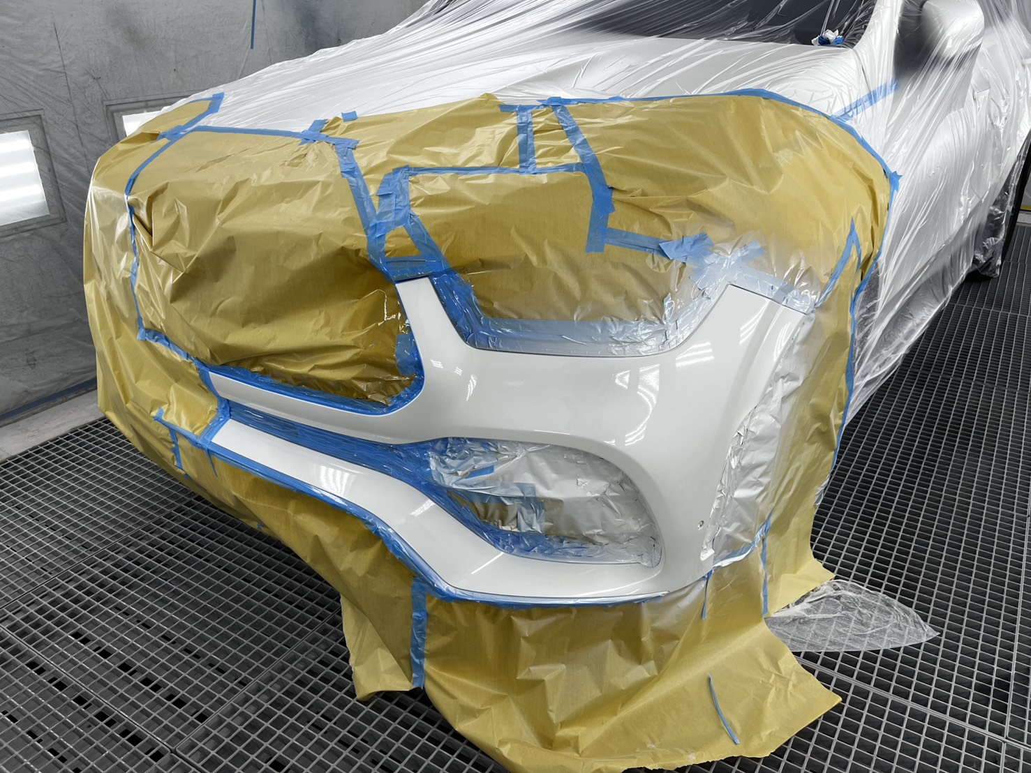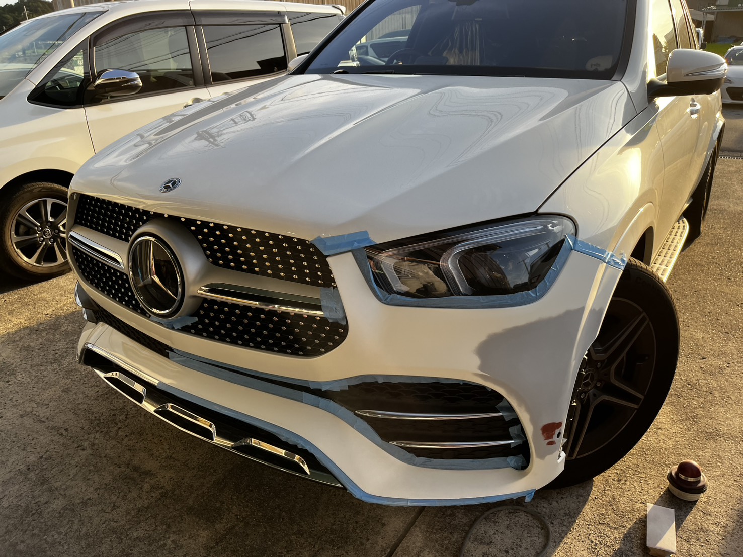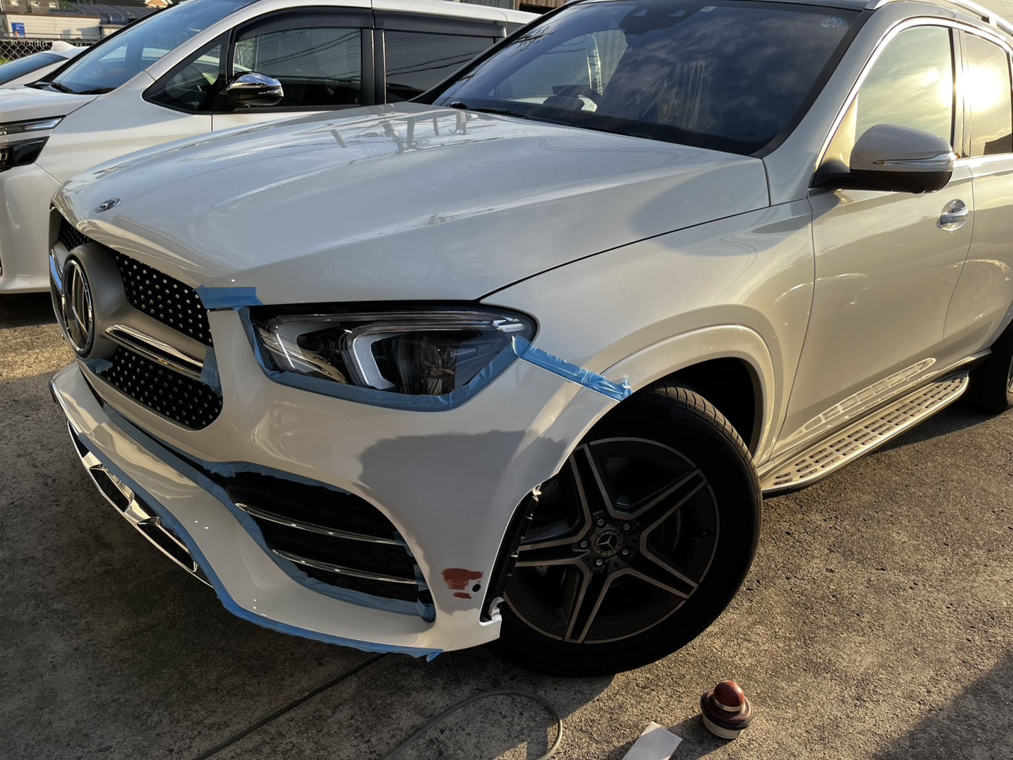 奈良県桜井市にお住まいのお客様より、ベンツ・GLEのフロントバンパーにできたキズとヘコミの修理をご依頼いただきました。輸入車ならではの高級感やデザインを損なわず、元通りの美しい仕上がりを目指して作業を行いました。