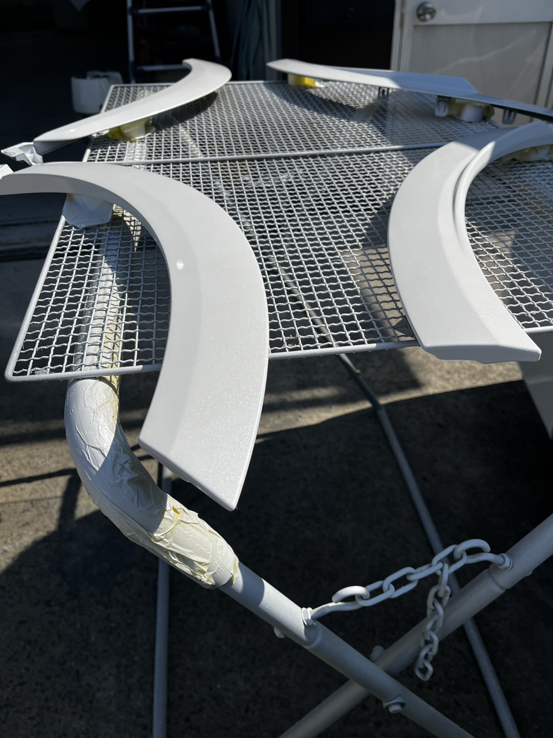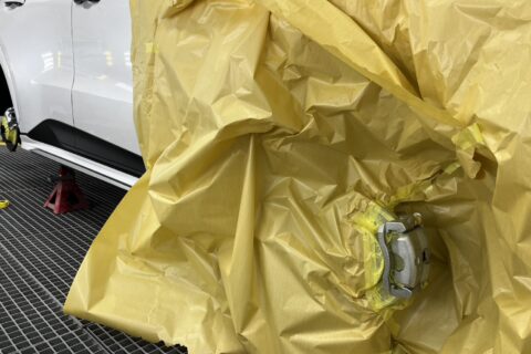 未塗装のフェンダーアーチモールをボディ同色に塗装する場合、通常の塗装とは違う特殊な下地処理が必要です。樹脂は塗料が剥がれやすいため、密着性を高めるためのプライマー処理を徹底。このひと手間が、耐久性と仕上がりの美しさを大きく左右します。