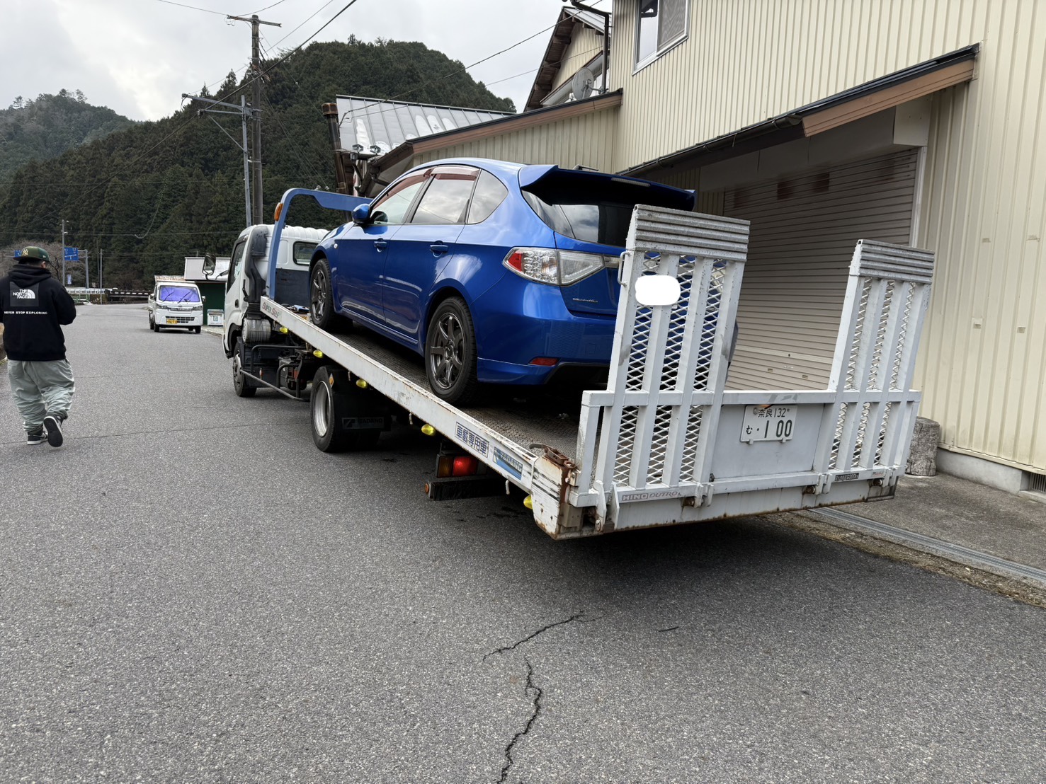 大淀町の現場から自社積載車で救出。大型のヒビでも安全に工場へ。