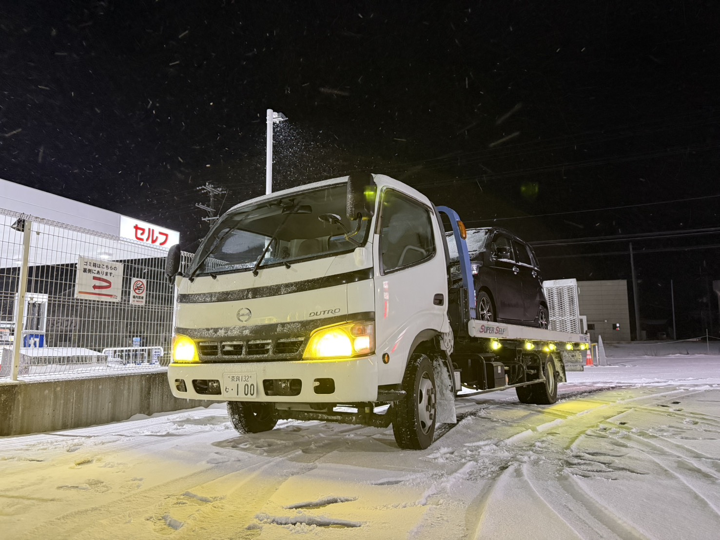 凍えるような寒さの中、一本のお電話をいただきました。現場は雪が深く、ホンダ・N-WGNが完全に脱輪して自走不可の状態。無理にアクセルを踏めば踏むほど深みにハマり、下回りを痛めてしまう恐ろしい状況です。まずはオーナー様の安全を確保し、専用の機材を積み込んで現場へ急行しました。